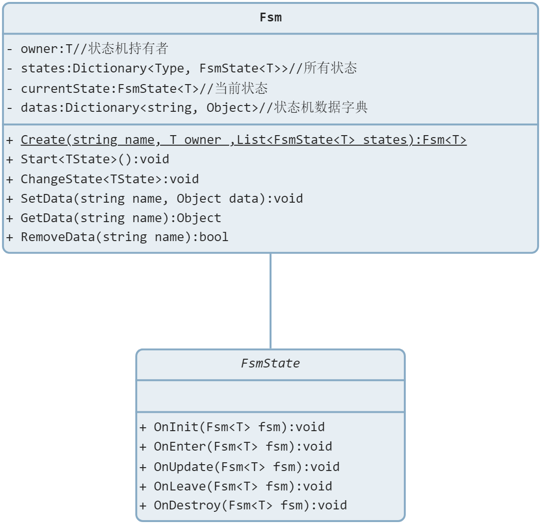 状态定义具体的逻辑,有OnInit,OnEnter,OnUpdate,OnLeave,OnDestroy生命周期。状态内调用状态机进行状态的切换。